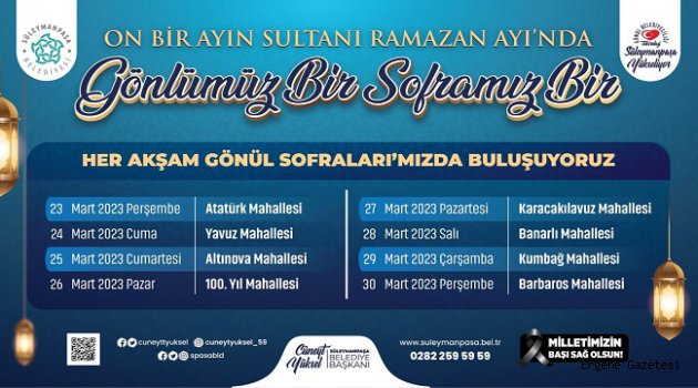 Süleymanpaşa Belediyesi Gönül Sofraları, Ramazan ayının ilk günü olan 23 Mart Perşembe günü Atatürk Mahallesi ile kurulmaya başlanacak. İkinci gün iftar programının durağı ise Yavuz Mahallesi’nde bulunan Osman Tabak Kapalı Pazaryeri olacak.
