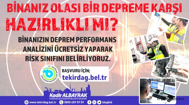 Taşıyıcı sistemi hasarlı yapılar, ruhsatsız yapılar, 01/01/2000 tarihinden sonra yapı ruhsatı almış yapılar ve prefabrik betonarme yapılar bina deprem performans analizi çalışmaları dışında kalmaktadır. Bahse konu tarih öncesi ruhsat almış binalarda yapılacak deprem performans analizi çalışmaları ücretsizdir. Başvurular sadece www.tekirdag.bel.tr internet adresi üzerinden yapılabilmektedir. Bu kapsamda deprem performans analizi çalışması ile ilgili olarak akılda oluşabilecek bazı soruların cevapları ise ‘Yapı Analizi Talep Formu’ ile açıklığa kavuşmaktadır.