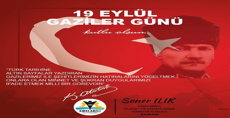 Kırklareli Ticaret ve Sanayi Odası (Kırklareli TSO) Yönetim Kurulu Başkanı Soner Ilık, “19 Eylül Gaziler Günü” dolayısıyla yaptığı açıklamasında; “Türkiye Büyük Millet Meclisi tarafından 19 Eylül 1921’de Mustafa Kemal Atatürk’e “Gazi Unvanı”nın verildiği günün yıldönümünde; istiklalimizi ve bağımsızlığımızı canları pahasına koruyan, ülkemizin her köşesinde huzurumuzu sağlamak için “Şehitlik” ve “Gazilik” mertebesine ulaşan kahramanlarımızı minnet ve saygıyla anıyorum.