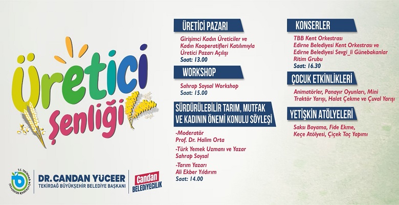 15 Ekim Dünya Kadın Çiftçiler Günü ve 16 Ekim Dünya Gıda Günü kapsamında Tekirdağ Büyükşehir Belediyesi tarafından düzenlenecek olan Üretici Şenliği, kadın üreticiler, tarım kooperatifleri ve gıda alanında fark yaratan isimleri bir araya getirecek. Kadın emeğinin gücünü ve yerel üretimin önemini öne çıkaracak olan program, sürdürülebilir tarım ve sağlıklı beslenme gibi konulara dikkat çekerken, çevre illerden katılacak kooperatiflerle bölgesel dayanışmayı da güçlendirecek.