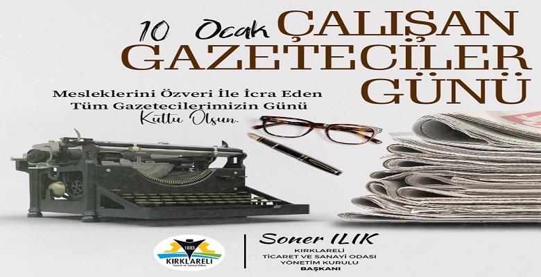 Kırklareli Ticaret ve Sanayi Odası (Kırklareli TSO) Yönetim Kurulu Başkanı Soner Ilık “10 Ocak Çalışan Gazeteciler Günü” dolayısıyla yayımladığı mesajında, Basının demokrasilerin vazgeçilmez bir unsuru olduğunu, kamuoyunun aydınlatılmasında da Gazetecilerin önemli bir görev üstlendiğini vurguladı.