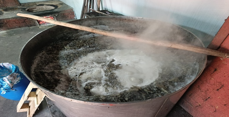 Parçalanan pancarlar kazana alınarak odun ateşinde yavaş yavaş kaynatılıyor. Yaklaşık 12 ila 14 saat süren bu işlem sırasında pancarın özü suya karışıyor ve “şıra” denilen tatlı su elde ediliyor. Daha sonra bu şıra süzülerek ikinci kez kaynatılıyor. Bu aşamada köylüler, pekmezin taşmaması için sürekli kazanın başında nöbet tutuyor.