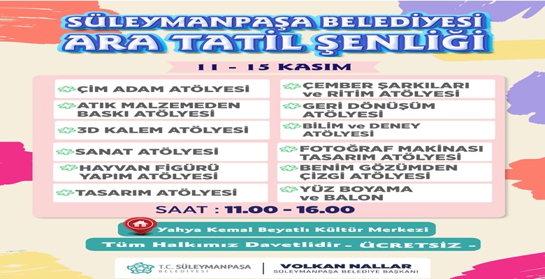Süleymanpaşa Belediyesi, ara tatili çocuklar için unutulmaz bir şenliğe dönüştürüyor. 11-15 Kasım tarihleri arasında Yahya Kemal Beyatlı Kültür Merkezi’nde gerçekleştirilecek Ara Tatil Şenliği, çocuklara dolu dolu bir program sunacak.