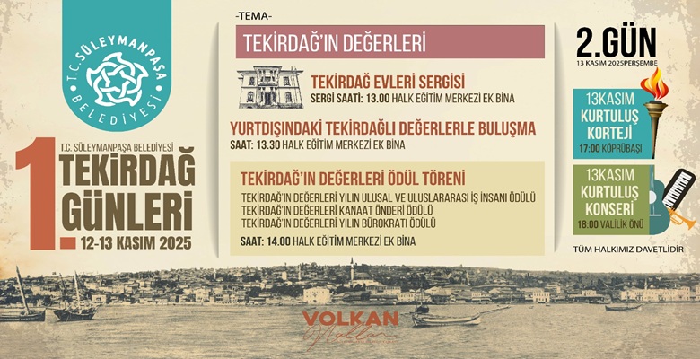 Süleymanpaşa Belediyesi, Tekirdağ’ın düşman işgalinden kurtuluşunun 103. yıldönümü etkinlikleri kapsamında, 12-13 Kasım 2025 tarihlerinde 1. Tekirdağ Günleri adı altında bir dizi etkinlik organize ediyor.