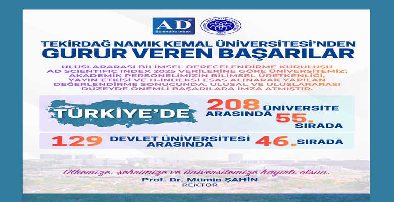 Üniversite, Türkiye genelinde tüm yükseköğretim kurumlarının dâhil olduğu tabloda da önemli bir konumda bulunuyor. AD Scientific Index 2025 verilerine göre Tekirdağ Namık Kemal Üniversitesi, Türkiye’deki 208 üniversite arasında 55. sırada, 129 devlet üniversitesi arasında ise 46. sırada gösterildi. Böylece Tekirdağ Namık Kemal Üniversitesi, hem tüm üniversiteler hem de devlet üniversiteleri sıralamasında orta-üst dilimde konumlanarak bilimsel performansını ortaya koydu.