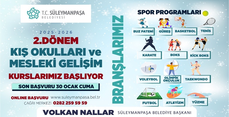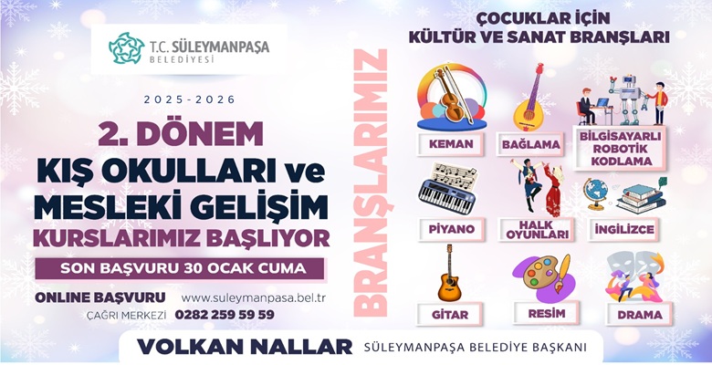 Süleymanpaşa Belediyesi tarafından çocukların gelişimine, sosyalleşmesine ve yeni hobiler edinmesine katkı sağlamak; yetişkinlerin ise boş vakitlerini verimli değerlendirmelerine ve kişisel gelişimlerini desteklemek amacıyla düzenlenen Kış Okulları kurslarının ikinci dönemi için kayıtlar başladı.