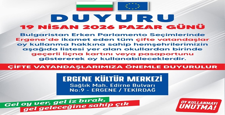 Ergene Bulgaristan Türkleri Derneği Başkanı Veis Özgür, 19 Nisan 2026 Pazar günü gerçekleştirilecek Bulgaristan erken parlamento seçimleri 2026 öncesinde önemli bir çağrıda bulundu. Özgür, Ergene’de ikamet eden tüm çifte vatandaşları sandığa gitmeye davet etti.